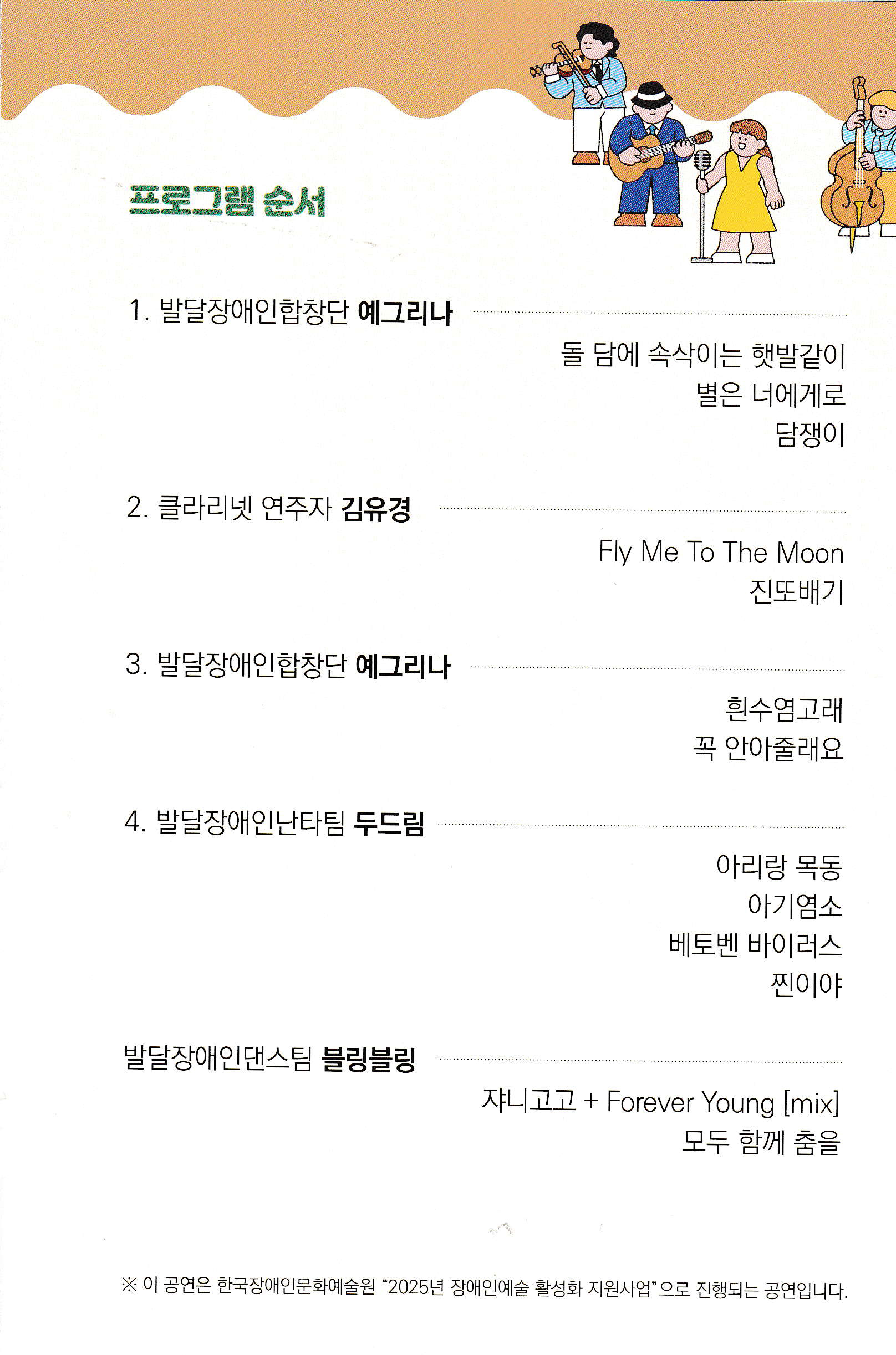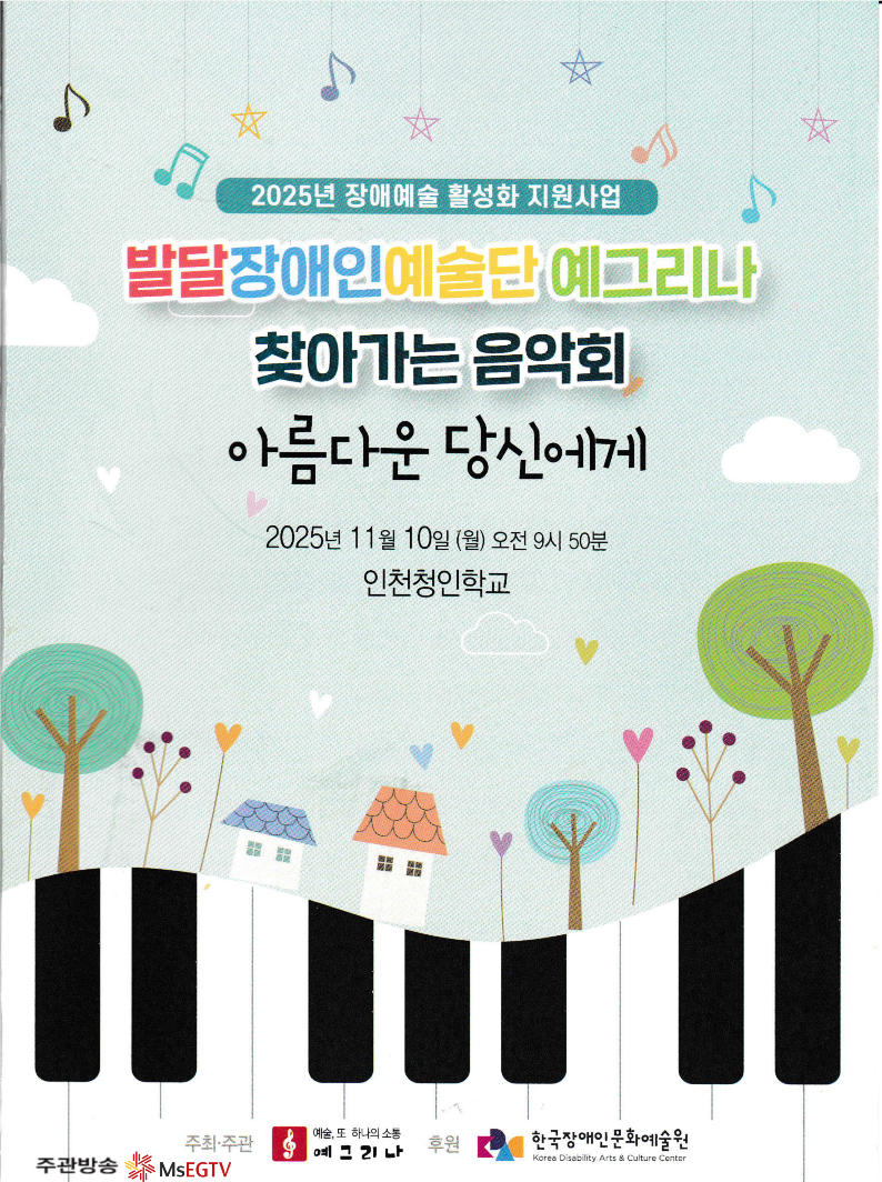 이번 공연은 한국장애인문화예술원 ‘2025년 장애예술 활성화 지원사업’의 일환으로 개최됐다. 인천 지역 발달장애 특수학교인 청인학교(11월 10일), 인혜학교(12월 3일), 서희학교(12월 4일)를 찾아가 예그리나 소속 예그리나합창단, 두드림난타팀, 블링블링댄스팀과 클라리넷 연주자 김유경 등 단원 50여 명이 장애학생과 교직원을 위한 무대를 선보였다.